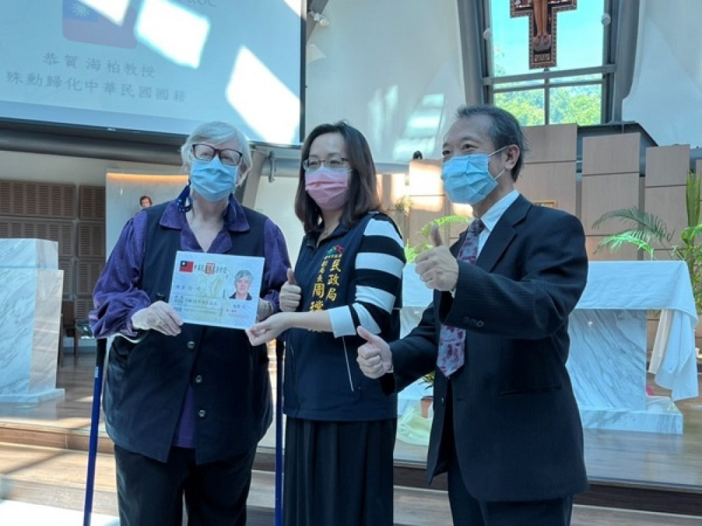 靜宜大學英國語文學系退休美籍教授海柏(Patricia Haseltine),在台奉獻英文教育逾40年,作育無數英才,4月經內政部核准殊勳歸化取得我國國籍,6月在沙鹿戶所取得身分證,成為台中市首位非神職殊勳歸化國民。靜宜大學25日(一)海柏教授生日舉辦授證典禮,慶祝教授取得我國國籍,民政局副局長周瑺玫代表市長盧秀燕前往祝賀並進行授證,感謝教授將生命中最璀璨的青春都奉獻給台灣與英文教育,並歡迎她成為台中市民。