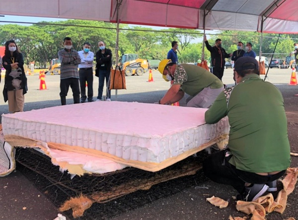 環保局說明,以人力手工拆解,每人拆解1連結式床墊需花費20到30分鐘,以鏟裝機拆解,平均5到6分鐘可拆解完1床,整體效率提升5倍,中埔鄉公所創下無彈簧床堆置紀錄。