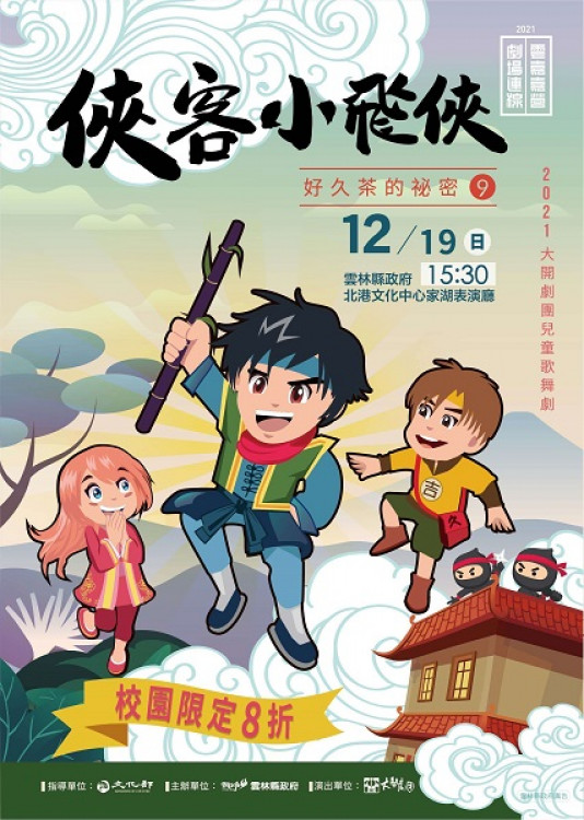 雲林縣政府邀請票房秒殺的大開劇團19日(日)下午3點30分在北港文化中心家湖廳售票演出兒童歌舞劇《好久茶的祕密9-俠客小飛俠》,校園8折優惠開賣。劇團特別加碼在演出前規劃2場免費「劇場導覽演出」限額60名,讓親子們透過一系列演出與互動體驗認識劇場,帶來一場精采有趣的戲劇旅程。