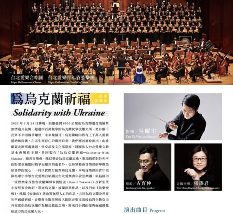 「為烏克蘭祈福—Solidarity With Ukraine慈善音樂會」將於4月17日下午3時在國家音樂廳舉行,演出詳情請洽台北愛樂網https://www.tpf.org.tw/,購票請洽TixFun售票系統https://bit.ly/3uSsoJ4。