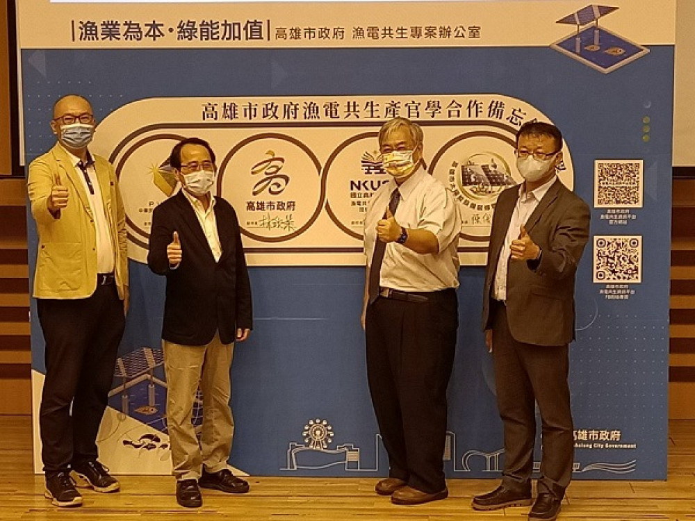 高雄市漁電共生政策推廣說明會第六場25日(一)下午3點移師阿蓮區舉辦,由高雄市林欽榮副市長邀請中央經濟部能源局、內政部營建署、台電公司與市府相關單位召開,為強化傳統養殖結合綠能的加值成效,高雄科技大學俞克維副校長與高科大漁電共生及友善養殖技術研究中心鄭安倉主任、高雄市太陽能設備裝修職業工會陳俊中理事長、中華民國太陽光電發電系統商業同業公會施維政副理事長與高雄市政府簽署產官學合作備忘錄,為高雄市漁電共生推動進程加油。