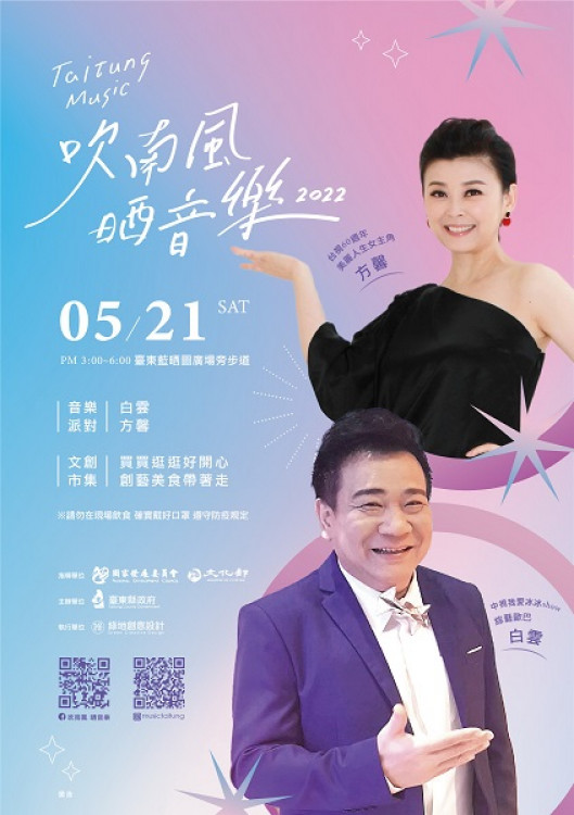 臺東縣文化處「2022吹南風 晒音樂」,第2場系列活動5月21日下午3點至6點,邀請戲劇女神方馨、綜藝歐巴白雲,現身臺東藍晒圖廣場旁步道登台熱唱,喜歡他們的朋友千萬不能錯過。