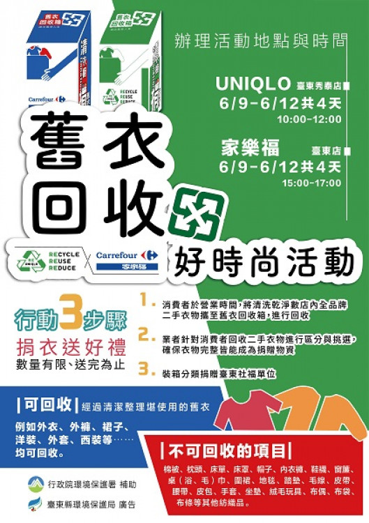 為讓民眾整理出來的舊衣能物盡其用,回收的舊衣依材質與使用情形,可經過回收再製或再整理轉送需要的人,延長舊衣使用壽命,臺東縣環保局與縣內連鎖服飾販賣業者UNIQLO、家樂福2家異業結盟,響應落實企業社會責任,9日(四)起至年底期間,在門市設置舊衣回收專區,環保局配合至6月12日在UNIQLO上午10點至12點、家樂福下午15點至17點,辦理4天的舊衣回收宣導活動,教導民眾舊衣回收正確的觀念與認知。