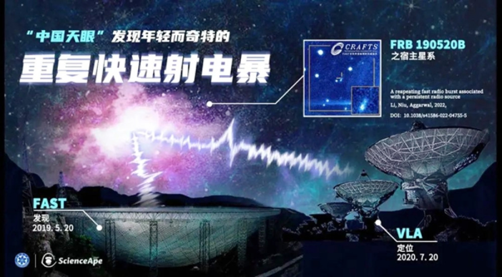 中國天眼FAST透過「多科學目標同時巡天(CRAFTS)」優先重大專案,發現了迄今為止唯一一例持續活躍的重複快速射電暴。快速射電暴的研究歷程並不長,2007年才在全球範圍內首次確定了它的存在,2016年探測到第一例重複爆發的快速射電暴,而此次中國天眼發現了首例持續活躍的快速射電暴。