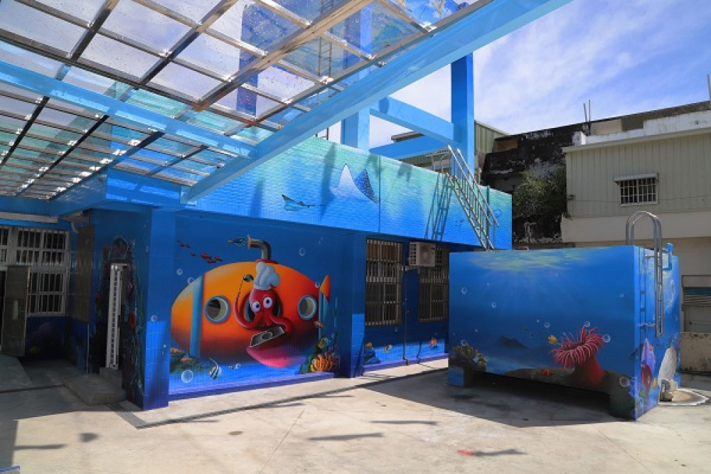從裡到外大變身,東石鄉作為濱海鄉鎮,外觀設計以學生熟悉的海洋為主,由湛藍海底世界逐漸轉換至蔚藍天空,結合遨遊的海洋生物、飄揚的鯉魚旗、飛翔的黑面琵鷺,讓廚房內外都動起來。