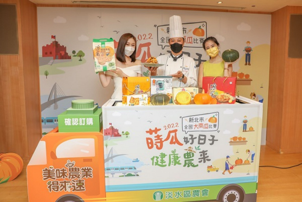新北市長侯友宜13日(一)化身南瓜大使,出席「蒔瓜好日子-健康農來」記者會,推廣淡水南瓜,義美食品契作淡水栗子南瓜製作甜點「南瓜芝士塔」,宣傳18日至24日在漁人碼頭福容飯店、淡水區市民聯合服務中心與淡海輕軌紅樹林站進行大南瓜比賽的優勝南瓜展示。