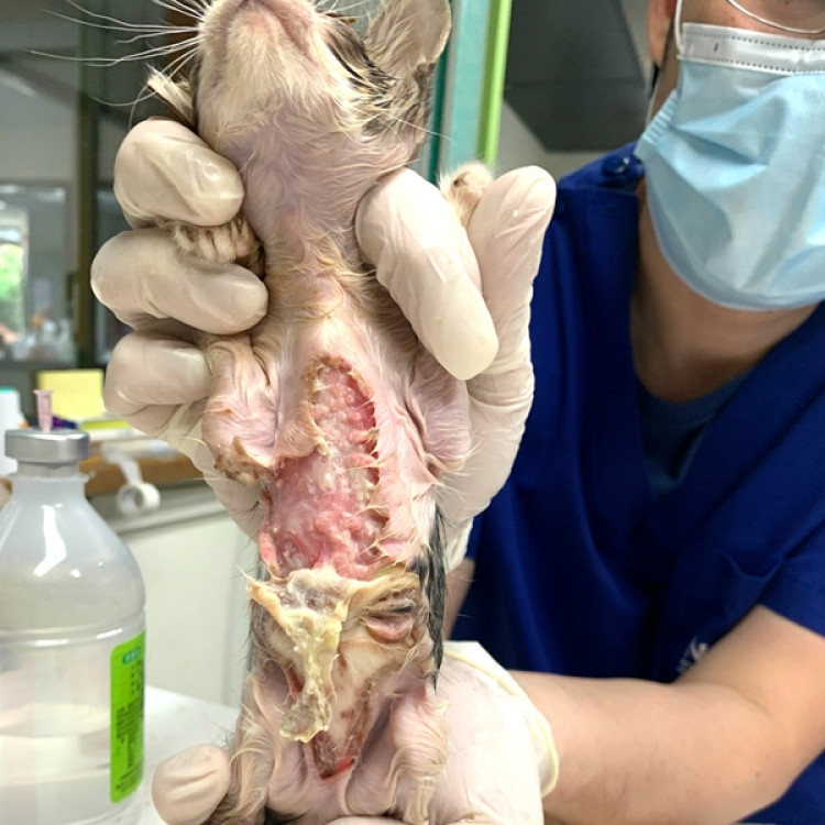 今年5月份一個下雨的深夜,一位民眾發現2隻約20日齡小貓咪蜷縮在水溝旁,全身溼答答一動也不動,動保處接獲報案後動保員到場將幼貓帶回毛寶貝醫療中心進行救治。獸醫師謝侑達發現其中一隻小貓腹部不明原因皮膚皮開肉綻,體無完膚,傷口深達鮮紅色肌肉層並不斷滲出血水,已經奄奄一息,蜷縮著身軀不斷發抖。立即手術治療,移除感染皮膚及給予輸液,將頸部以下全身上藥包紮。