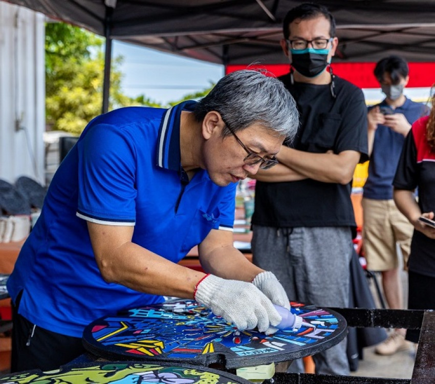 為謹慎確保色彩能忠實呈現,水利處和8位知名設計師一同南下到台中人孔製造工廠進行校色,一起下場親手為這次的人孔模型上色,共同觀摩人孔的製作過程。