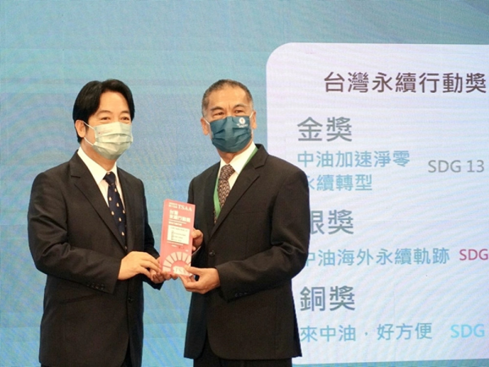 2022 TSAA台灣永續行動獎12日揭曉獲獎名單,台灣中油公司一舉奪得金、銀、銅三座大獎殊榮,展現國營事業永續發展的最佳模範,員工也共享榮耀;活動由董事長李順欽親自出席接受副總統賴清德表揚。