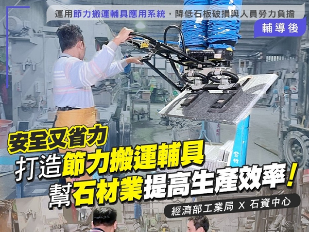 石資中心根據廠商需求,研析國內外不同場域之搬運輔具相關應用資料,並結合國內石材加工廠製程流程狀態,規劃設計符合國內石材加工廠之搬運輔具,並針對板材側邊研磨製程、板材水刀/橋剪切割等不同製程,開發真空吸盤模組、旋臂吊掛搬移模組,共完成「橋剪加工板材」、「帷幕擴孔製程板材」及「側面邊角研磨製程板材」等三種適用不同製程之節力搬運輔具應用系統,可搬運最高達500公斤之石材板材;藉由政府輔導能量延伸,目前已輔導欣達鴻公司、元裕石業公司、紫竹石業公司、華華公司及東星名石公司等5家廠商;而廠商實際運用「節力搬運輔具應用系統」在生產線上後,有效縮短生產線等待時間,且作業人員使用真空吸盤吸取石板無須徒手搬運,並降低工安發生率。