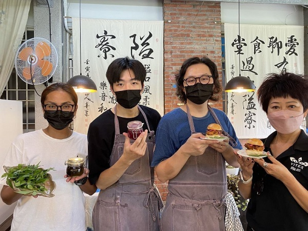 午后坐在苦楝與黃荊交織而成的樹蔭下,品嚐由擔任薩瑪法國小館主廚陳楷為帶領的廚師許振凱等團隊,教導社區媽媽們製作的黃荊橄欖油、醋醬為基本醬底的創意美食,如黃荊油漬白蝦塔塔、黃荊雞腿堡等下午茶派對餐點。
