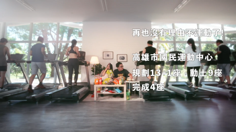 如果舒服窩在沙發看電視時,突然燈光亮起,身旁忽然有人走過,竟然穿越到明亮的運動中心,一定會像照片中的男女主角不知所措。高雄市政府以幽默反差方式,呈現市府致力提升全民運動意識,營造友善運動環境,兩年內從無到有,規劃13+1座運動中心。