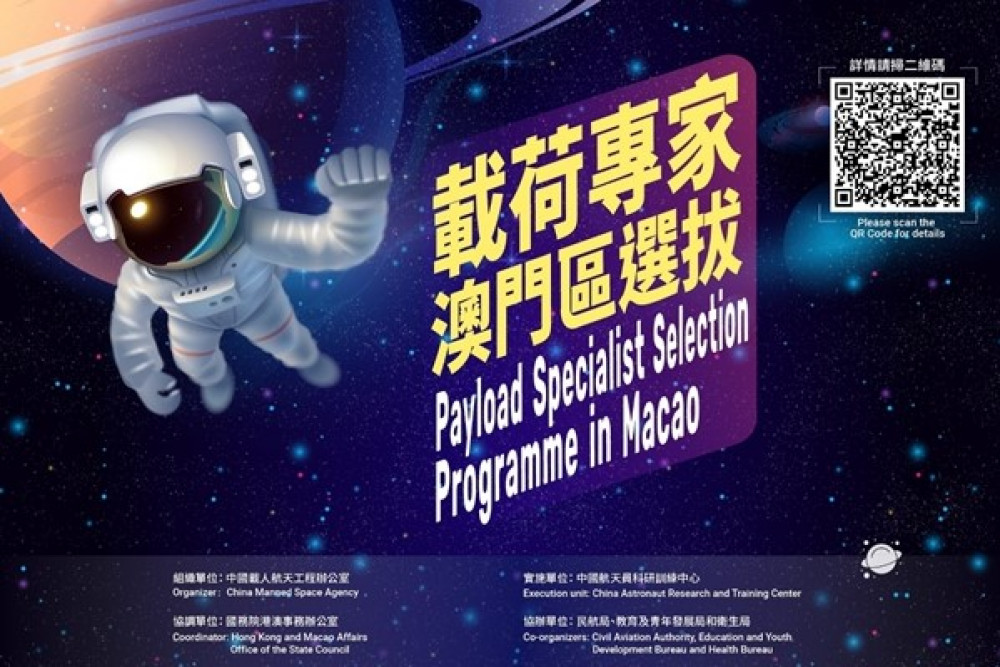 澳門特別行政區政府獲中央政府支持參與國家航天事業發展,在澳選拔載荷專家,擔任在太空進行空間實驗研究,以及操作空間實驗設備等科研工作。載荷專家澳門區選拔充分體現了國家對澳門的關愛和支持,選拔共分初選、複選和定選3個階段,特區政府已開展報名工作,由即日起開始報名至 10月17日截止。
