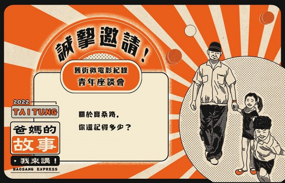 由臺東縣政府推動的「2022臺東舊街文創聚落記憶重現紀錄計畫」,將以戲劇工作坊與微電影拍攝方式,記錄舊街生活與故事,計畫以「爸媽的故事,我來講!」為主題辦理系列活動,首波活動青年座談會10月13日晚間7點30分,在中華會館舉行,邀請對地方文史、表演藝術、影像製作有興趣的朋友們共襄盛舉。
