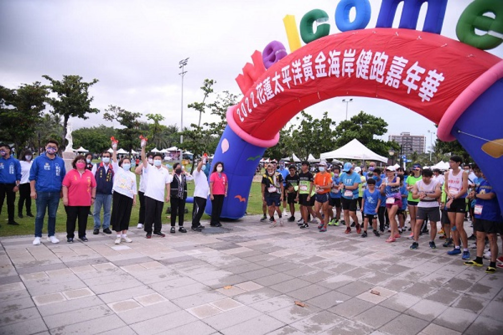 花蓮市15日(六)綿綿細雨,卻不澆熄民眾對體育賽事的熱衷心情,繼上午獅子會在七星潭舉辦千人健走淨灘活動,下午花蓮縣體育會在北濱公園舉辦「2022花蓮太平洋黃金海岸健跑嘉年華」,讓體育賽事不間斷在花蓮運動大縣展開,縣長徐榛蔚鼓勵民眾養成運動好習慣。