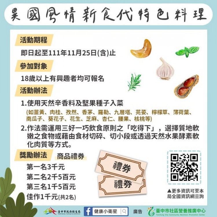 台中市衛生局舉辦「異國風情新食代特色料理食譜徵稿活動」,鼓勵各界發揮創意、關注銀髮族健康營養,以天然辛香料取代過量食跟味精,認識均衡飲食原則。徵稿活動即日起至11月25日,活動前五名可獲等值商品禮券,入選的投稿作品可參與精美小禮物抽獎,邀請有興趣的民眾設計出美味兼具高齡友善的餐點。