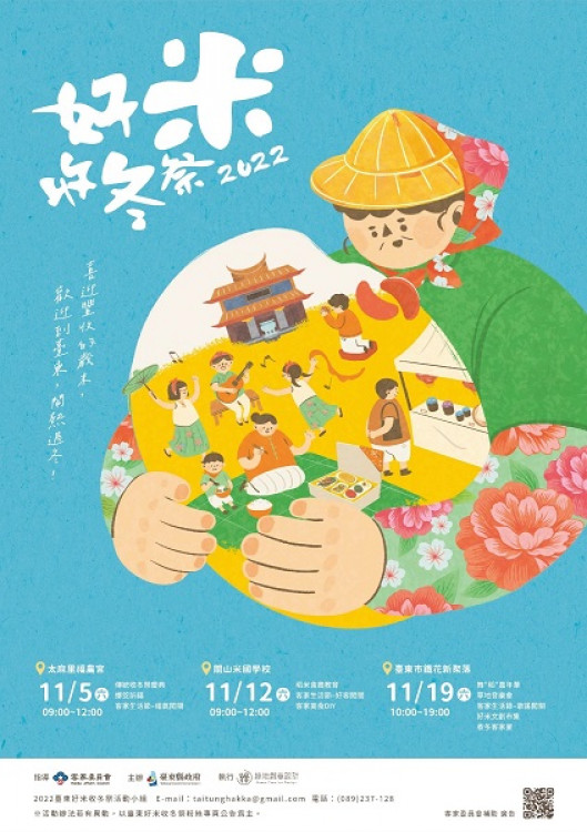 臺東好米收冬祭在「臺東客家月」期間,每周六安排不同類型的客家活動,除11月5日「好米收冬祭典」,11月12日在關山米國學校的闖關親子活動受理報名中,壓軸場11月19日在鐵花新聚落有舞「稻」嘉年華、收冬客家宴、好米文創市集、客家歌手雲集的草地音樂會。