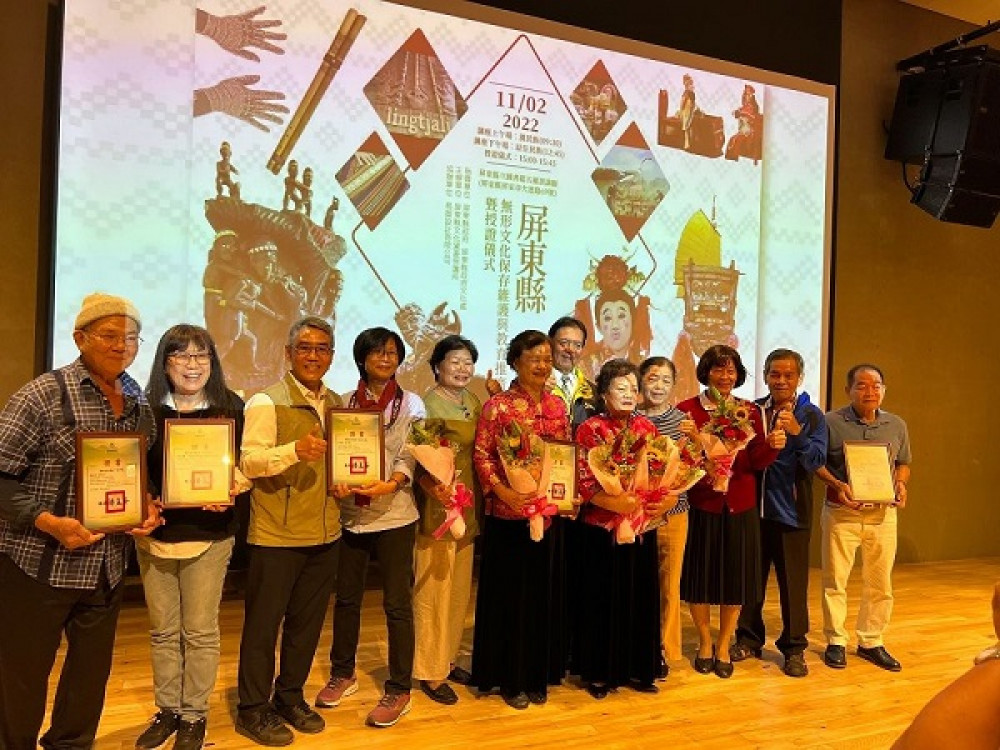 為落實無形文化資產保存的重要性,屏東縣政府2日(三)舉辦無形文化資產座談會暨授證儀式,頒發認定證書給30項50位保存者與團體,感謝他們在各自的領域默默耕耘,為保存、傳承藝術文化努力付出與奉獻。授證包含增列的保存者,新公告的保存團體與保存者,還有已故的保存者追贈儀式,呈現各族群的特色與文化主體性。