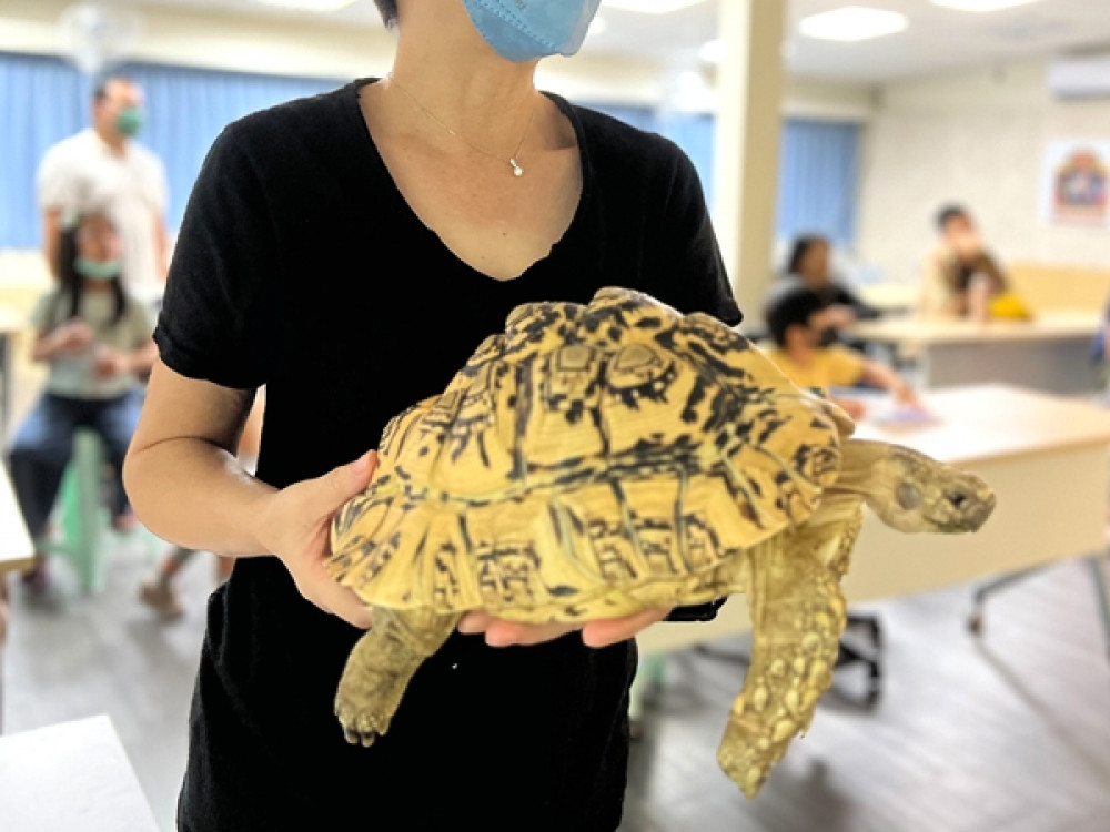 參加課程的飼主陳先生表示,很高興動保處顧及非犬貓寵物飼養族群,特別開設課程給民眾參加。這次上完課程後收穫滿滿,學習到了許多飼養特殊寵物的訣竅,自己原來將蘇卡達象龜「卡咪」飼養在房間內,夏天天氣較炎熱時,室內會開冷氣,和「卡咪」一起吹冷氣,然而透過這次上課了解,隨著環境溫度變化會導致陸龜代謝率下降且容易感冒,保溫燈及保暖墊是必須的;另也應提供各式各樣的蔬菜、植物等高纖維質的食物及營養素,避免單一種類蔬果導致營養不良。