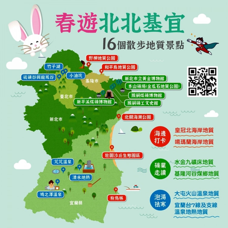 2023兔年到來,經濟部中央地質調查所特別挑選台北市、新北市、基隆市、宜蘭縣等縣市16處一日遊地質景點,推薦民眾「散步」欣賞本區在不同時空、地質作用與歷史背景下,所衍生出的景觀、礦業聚落、泡湯、文史與特產等,感受高CP值旅遊。