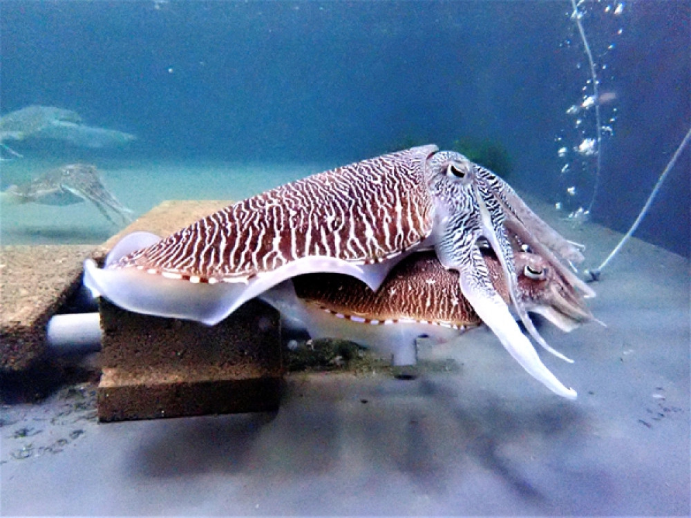 我省北部和東北部海域是虎斑烏賊主要的棲地,當海水逐漸溫暖時,花枝們也洄游至近岸海域準備進行交配。趁此時機,新北市政府與國立台灣海洋大學共組的花枝繁殖復育團隊,正在新北市海洋資源復育園區繁殖復育花枝,大花枝們樂活在海水養殖池中進行愛的活動,新北市漁業處歡迎民眾前來預約參觀了解海洋生物的無限奧秘。
