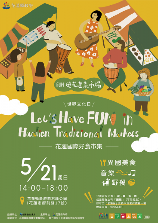 5月21日是聯合國「世界文化日」,為推廣花蓮優質的有機農產與多元文化,花蓮縣政府與國家發展委員會合作辦理「Fun遊花蓮菜市場(Let’s Have Fun In Hualien Market)」活動,以「國際好食市集」、「好食餐桌」為兩大主軸,融入穿衣密碼(Dress Code)主題野餐、手作文創、音樂饗宴等內容,透過在地好食材與異國料理的呈現,展現文化平等與多樣性。