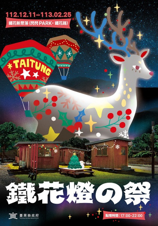 為歡喜迎接12月的耶誕季,臺東縣政府在鐵花新聚落首度推出「鐵花燈の祭」活動,五大展區主題燈飾包括「耶誕大麋鹿」、「雪寶拍拍樂」、「冰晶雪世界」、「水漾幸福門」、「夢幻光城堡」與各種浪漫燈飾,點燈儀式12月11日下午5點在鐵花新聚落-閃閃PARK舉行。