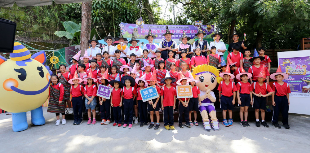 市府政風處為了給學生們驚喜,創意佈置校園,學生們通過魔法門後要收集3件寶物,魔法帽、裝滿品德智慧的魔法書包及品格魔法書,吸收課程知識,變身成真正的廉潔魔法師。參與的貴賓也在通過魔法門後,戴上魔法帽,繫上魔法大領結,手持魔法棒,變身魔法師與孩子們一同開啟品德智慧旅程。