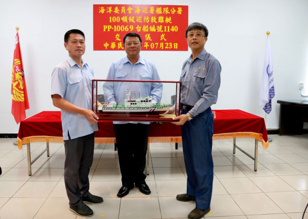 海洋委員會海巡署艦隊分署委由台船建造 100噸級次艘巡防救難艇,日前在基隆廠舉行交船文件簽署儀式,由海巡署艦隊分署吳金河副分署長及台灣國際造船公司周志明副總經理共同簽署交船文件,儀式因應防疫期間簡單隆重,觀禮貴賓有海巡署、船舶暨海洋產業研發中心、中國驗船中心、BV驗船中心等。
