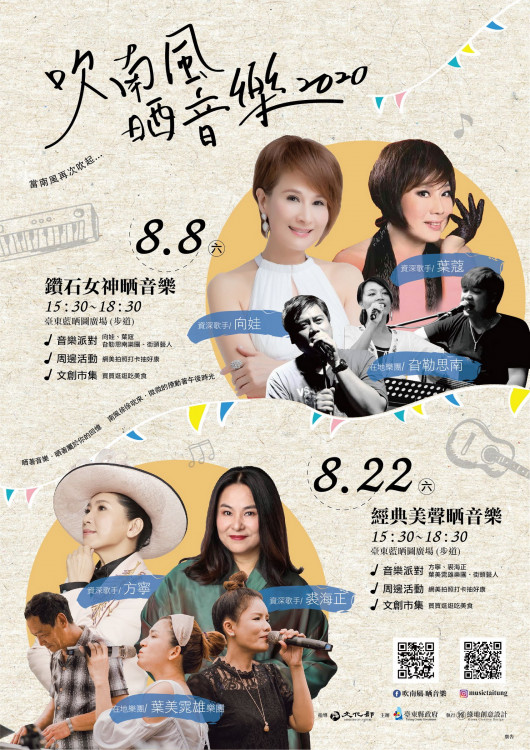 臺東縣文化處8月「吹南風 晒音樂」,8日及22日舉辦2場,邀葉蔻、向娃、方寧及「臺東女兒」裘海正等,鑽石般和美聲級的女神蒞臨。