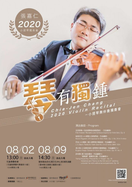 雲林縣政府為讓民眾在暑假期間,能有更多元的藝文觀賞活動,9日(日)下午2點30分,在北港文化中心家湖表演廳辦理「琴有獨鍾」小提琴獨奏會,邀請國立臺東大學音樂學系張嘉仁教授,演出有別以往的音樂會,節目充滿巧思,千萬不要錯過。