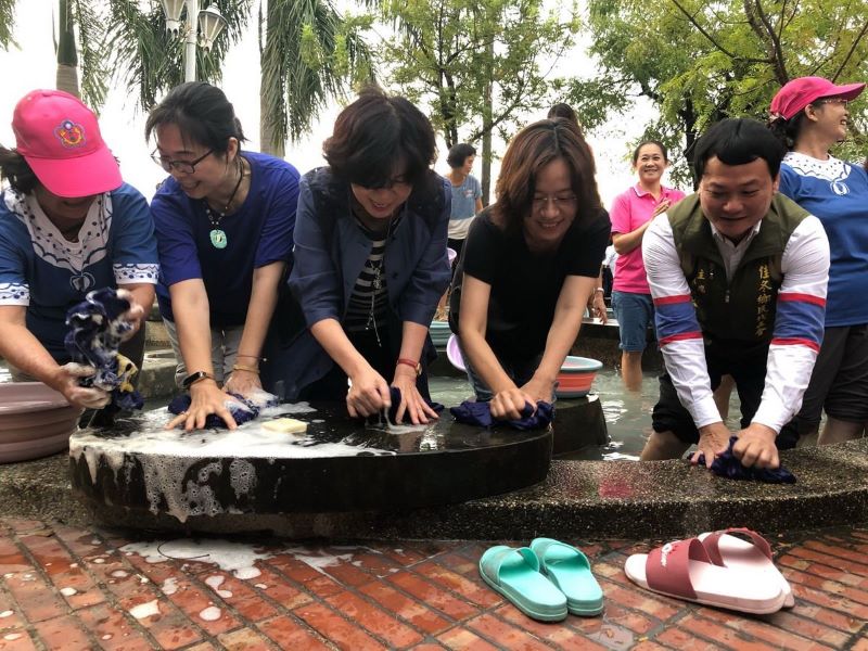 當地學生以藝文表演形式慶祝,阿爸阿姆阿公阿婆一旁拿著臉盆番鹼(洗衣皂)助興,以唱唱跳跳的場景向鄉親宣布,洗衣場又回來了。