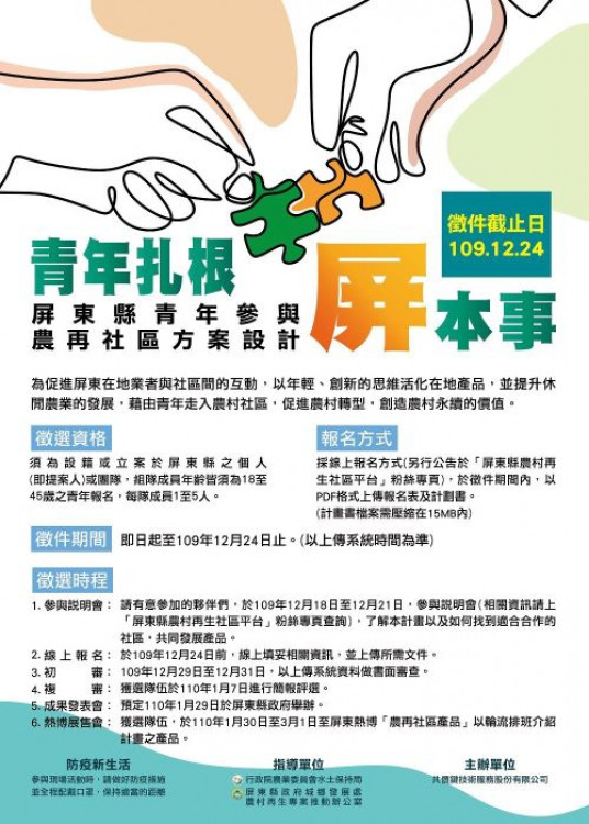 徵件投稿自12月10日至12月24日止,歡迎有志青年們加入,共創和諧共榮的新農村。更多「屏東縣青年參與農再社區方案設計」資訊,請追蹤「屏東縣農村再生社區平台」粉絲團;相關報名及徵件辦法請至報名表單(https://forms.gle/F48mot94MZuBvXEV6)查詢。填寫報名表或對提案有問題及任何疑問,歡迎使用LINE@(LINE官方帳號搜尋:@530sgceh)線上諮詢!也歡迎與我們聯繫:電話:0912-784-6季先生/0983-592-865鄭小姐,E-mail:services@covalentbond.com