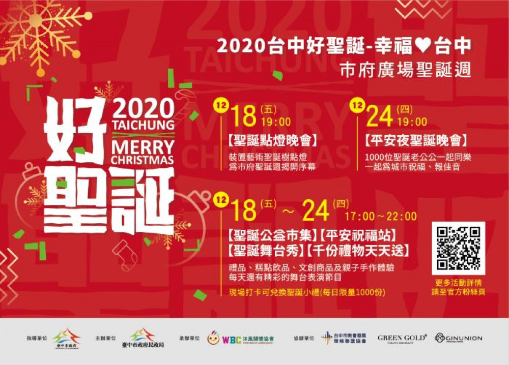 台中市政府攜手台中市沐風關懷協會及中部地區各天主教與基督教會,18至24日在府前廣場舉行「台中好聖誕」聖誕週活動。24日(四)「平安夜聖誕晚會」晚間7點溫馨展開,除由各教會帶來舞蹈、弦樂團、現代樂團及百人大詩班等精彩表演,千名聖誕老公公齊聚廣場前報佳音。
