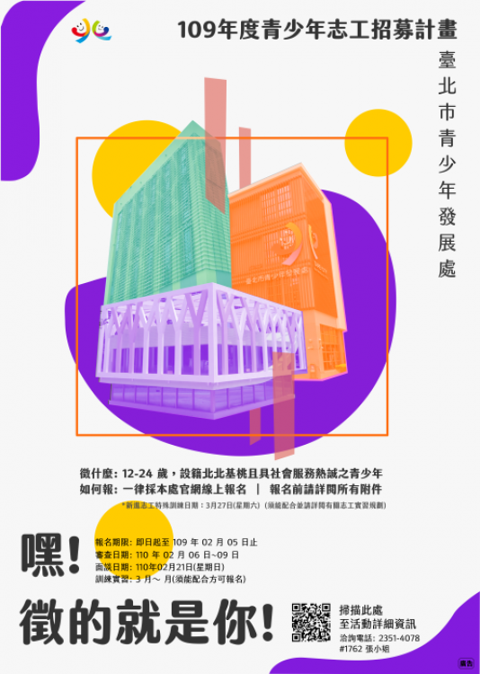 青少年志工的招募對象為12歲至24歲設籍臺北市青少年,或就讀臺北市、新北市、基隆市、桃園市的國中以上各級學校學生(含自學生),更重要的是,需具社會服務熱忱。青發處接受報名後將辦理面談,錄取者須修習臺北E大線上志工基礎訓練課程,及參加青發處辦理的青少年志工特殊訓練,通過實習後,青少年志工可取得衛福部志願服務手冊,開啟一輩子的志願服務時數存摺。招募期間自即日起至110年2月3日止,詳情及報名資訊請參看青發處官網(https://reurl.cc/R1xAOG) 。