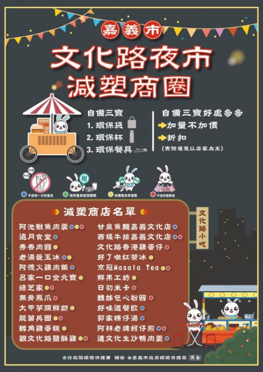 24家減塑友善店家分別為阿池魷魚肉羹、遠月食堂、老湯愛玉冰、甘泉魚麵嘉義文化店、綠芝家、無骨鳳爪、呂家一口金元寶、大甲芋頭鮮奶、脆薯兵團、轉角雞蛋糕、觀文化路鹽酥雞、鮮果工坊、文化路香港雞蛋仔、好了啦紅茶冰、京冠Masala Tea、日初米卡、魏姊包心粉圓、好味道餐飲、郭家粿仔湯、西堤牛排嘉義文化店、阿林老牌蚵仔煎、達文化生炒鴨肉羹、阿德火雞肉飯,呼籲民眾養成自備環保餐具習慣,降低一次性餐具使用依賴性,樂當不塑之客,減少對環境之傷害。