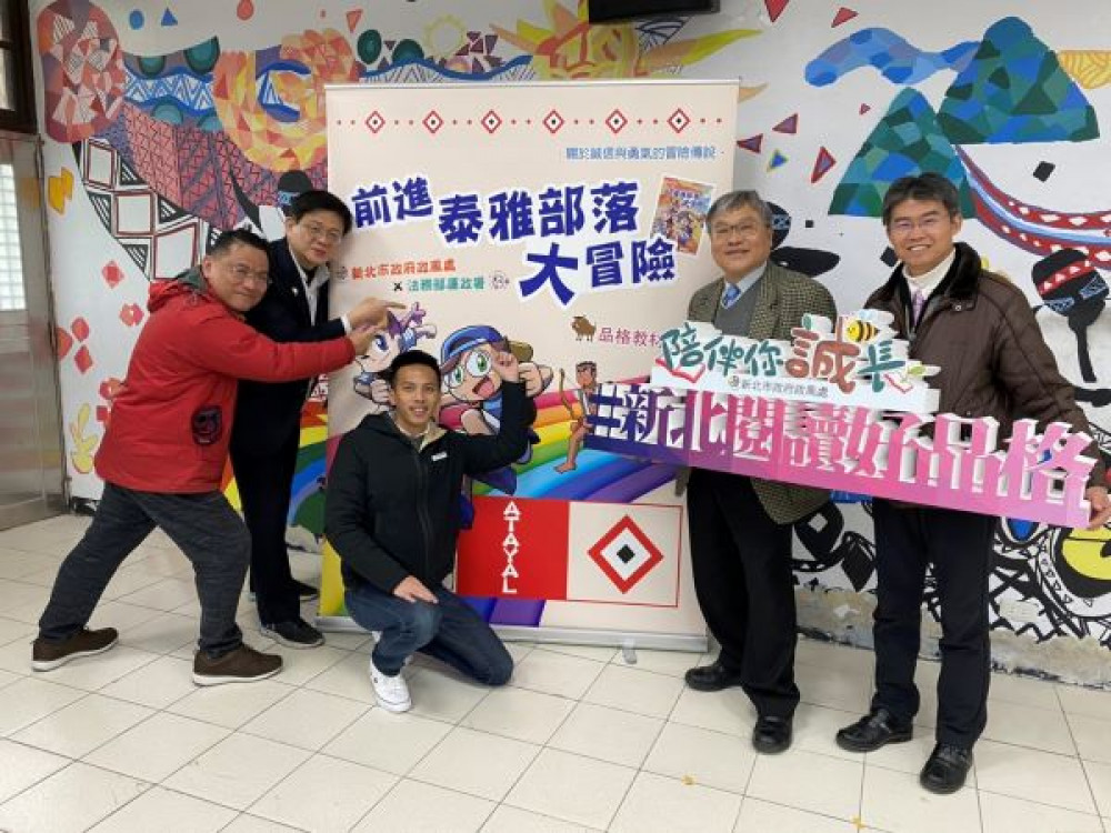 新北市政風處為宣導校園誠信,加強學童品德教育,12日(二)下午在烏來國中小辦理「前進泰雅部落大冒險」漫畫品德教材贈書活動,新北市議員馬見Lahuy.Ipin、原民局長羅美菁、法務部廉政署葉建華組長、烏來區長周守信及退休校長高元杰等貴賓見證,贈書給烏來國中小校長陳煌燿及福山國小校長陳進德。