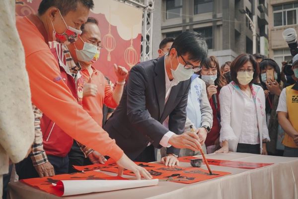 為應景年節喜氣,陳其邁與書法老師現場揮毫「邁向幸福 高雄大好」的春聯,預祝高雄新的一年奔向幸福、希望;與「亞洲美食天王」陳鴻,用三鳳中街食材試做養生美食年菜,充滿濃厚年節溫暖氛圍。