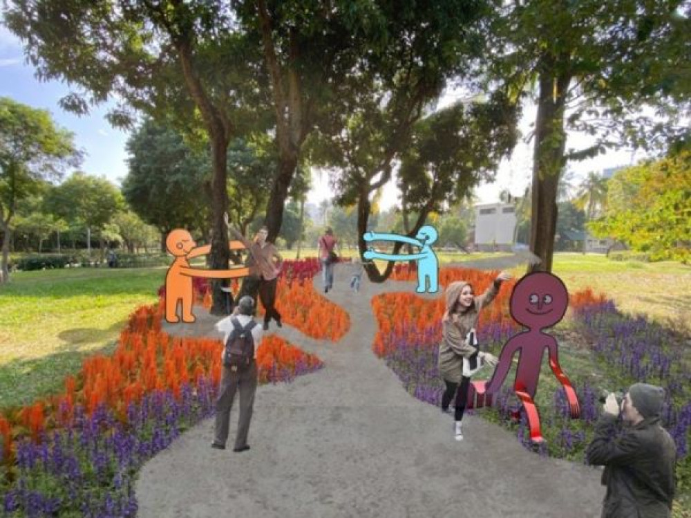 永康公園以「舞動精靈」為春節妝點的主題意象,公園入口廣場設置繽紛的草花妝點入口景觀;中央廣場區採用不同色系的草花植栽,透過五彩花海營造迎春喜氣的年節氛圍,結合亮麗的五彩人型立牌,提供在花卉迷宮裡尋找雀躍、跳動的可愛小精靈,讓民眾感受戶外的清新自然,作為迎接2021的開場白,打開充滿希望的新年。