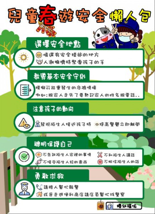 「兒童春遊安全懶人包」包括慎選適合兒童而且大人能掌握的安全地點;出遊前,教導孩童基本安全守則;隨時留意孩童的動向及安全;教導小孩「SMART」自我保護原則;Tell告訴信任的人:遇到陌生人搭訕要趕快跟信任的大人說;當自己感到不舒服或是覺得不安全的時候,一定要趕快跟大人求救或是撥打110、113向警方求助。