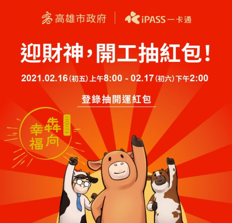 高雄市政府與一卡通公司除夕夜舉辦「線上領紅包」活動,因民眾熱烈踴躍參與,系統壅塞,宣告活動暫緩擇日再辦。市府日宣佈,線上領紅包活動16日(大年初五)再次舉辦,16日上午8點起到17日下午2點,民眾可以透過高雄市政府LINE官方帳號中的活動訊息,點擊完成線上登錄,僅需登錄身分證字號即可參加。同時,線上紅包加碼加倍,數量由原先5萬包增加至10萬包,讓更多民眾能開心迎財神接財氣。
