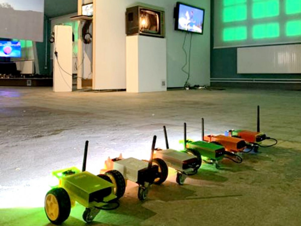 )遠距操作遙控車,每台遙控機器人都配置了迷你攝影機,可以自由地在400平方公尺的展場中移動,並顯示展品資訊。