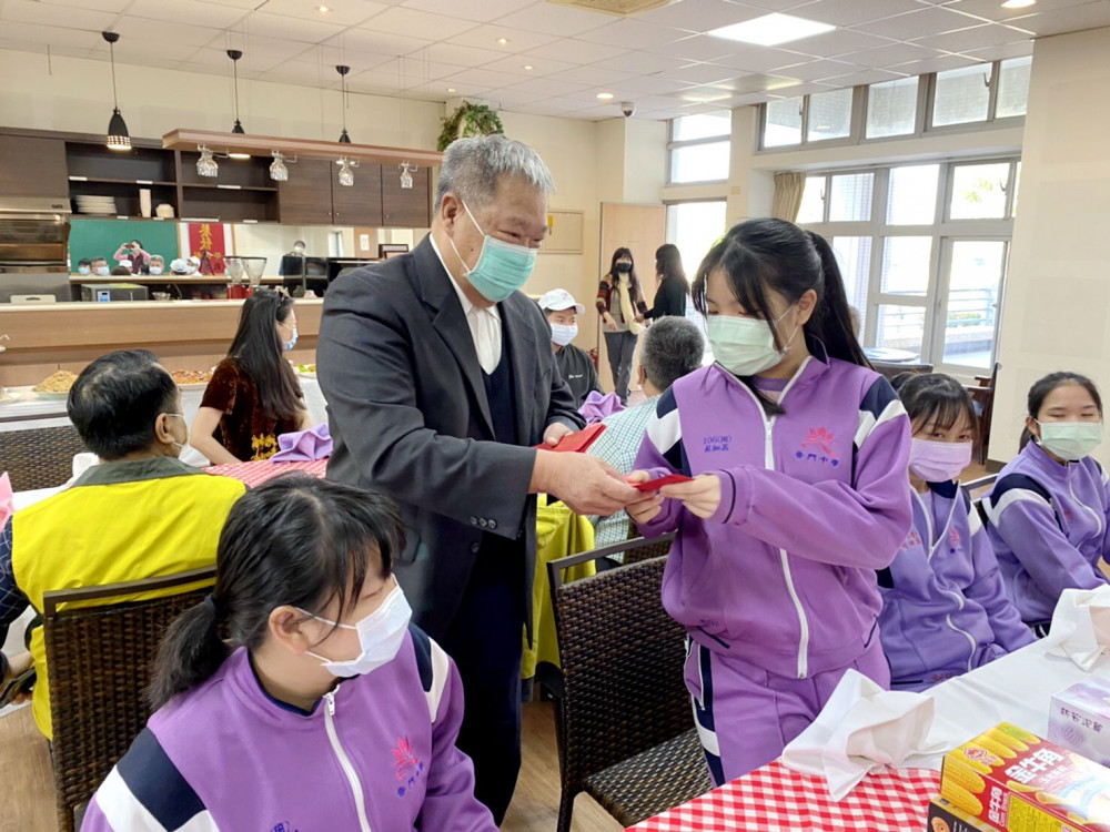 隨著國際化腳步,佛光山普門中學多年來對該校外籍生的照顧師長們也視同己出,日前在該校餐飲管理教室舉辦外籍生感恩惜食餐會,此次首度與高雄慈善聯合總會阿福食物銀行合作,由他們提供食材,學生們設計菜單烹調,集體創作,校長蔡國權發給每位學生紅包,祝福平安吉祥、健康,學業進步。