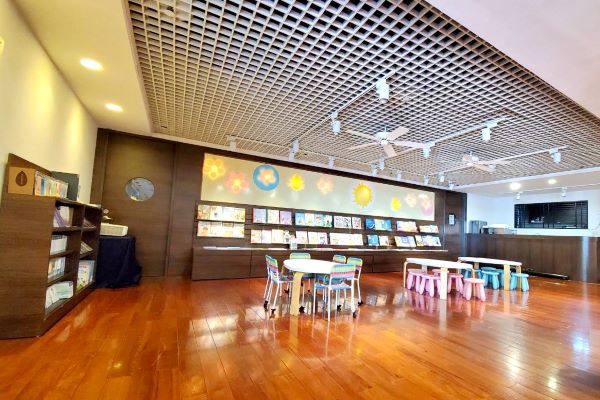 靜思堂書軒165坪的情境空間,不僅賣書、賣茶、賣咖啡,還有一座兒童館,豐富的典藏童書,經過設計、高度適中的桌椅,讓好動的孩子一到這裏就被吸引住。整體空間運用裝置藝術塑造陽光的閱讀情境,除了開放自由入場的閱讀時光,也推出「小小講堂」活動,每週一堂課,每月一個品德教育主題課程,由教聯會老師與大愛媽媽攜手合作,讓故事達人為孩子們導讀繪本,開啟色彩圖像語言的力量,也讓詩意詞句喚醒孩子對文字的感覺與溫度,就是要讓孩子愛上閱讀的童話王國。