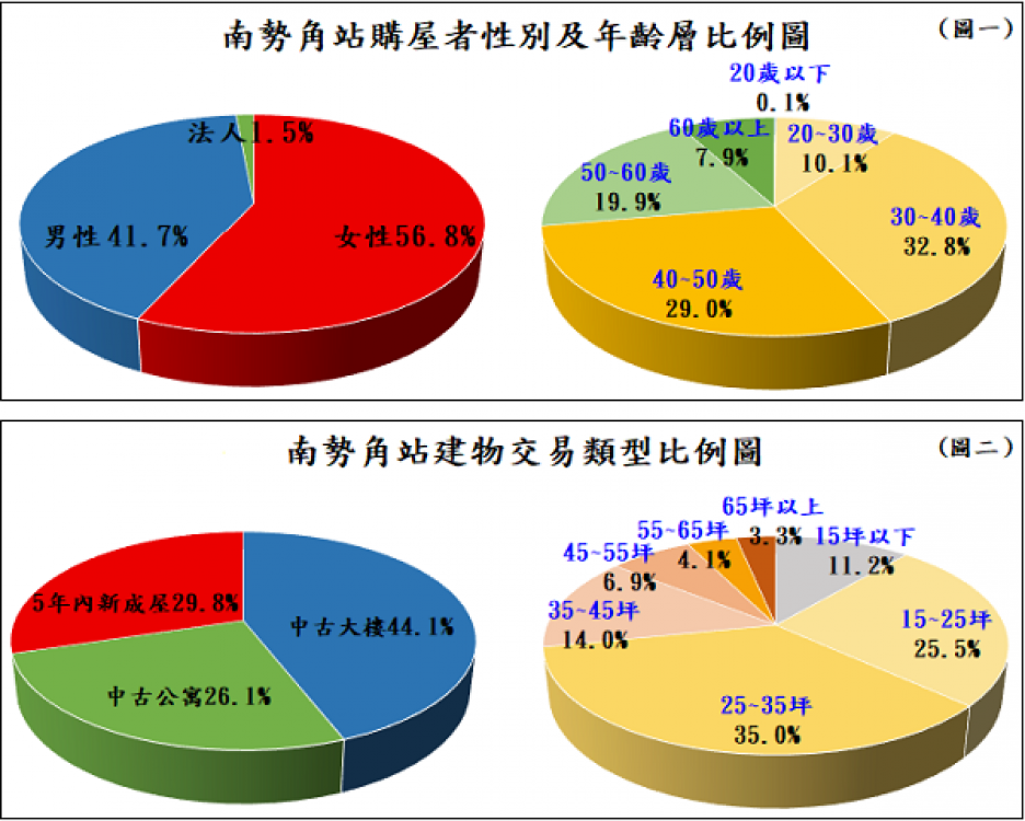 中和地政事務所陳素霞主任表示,南勢角生活圈女性購屋者超過半數以上(圖一),年齡層以30至50歲青壯年為主力客層;最受市場歡迎的建物類型為中古大樓(圖二),房屋大小介於25坪至35坪。可見女性及青壯年人口仍是市場購屋主力。安全考量下,有管理室的電梯大樓受女性購屋者青睞,中小坪數物件可減輕年輕購屋者房貸負擔。