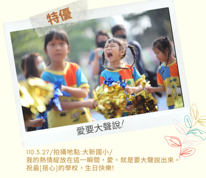 臺南市教育局辦理「2021臺南市兒童藝術教育節~Camera!精彩一瞬間兒童藝術教育學習歷程-攝影圖文徵件比賽」,得獎名單出爐,大新國小許麗娜老師「愛要大聲說」、海佃國中吳德祥老師「光影偶戲,春天起『藝』」,及六甲國小張鳳玲老師「暖冬的彩虹」獲選特優,得獎作品將在臺南市兒童藝術教育節臉書粉絲專頁,年底臺南市兒童藝術教育節活動中展出。