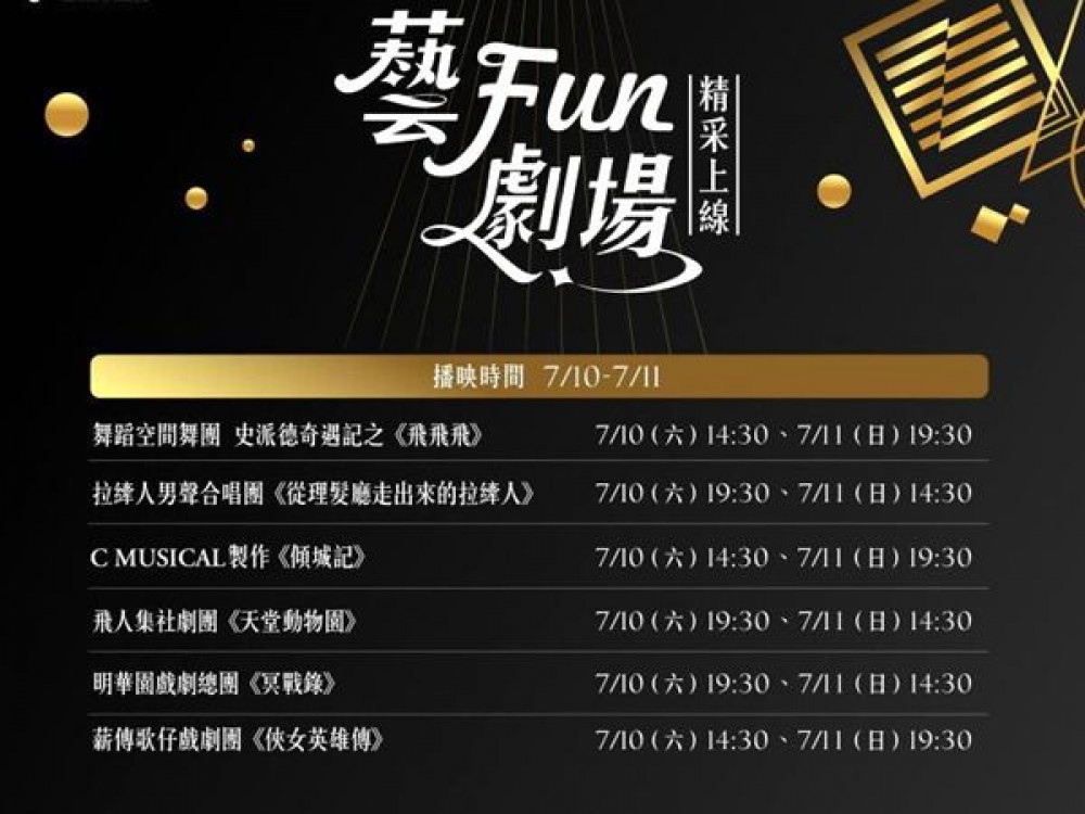 《藝Fun劇場—精采上線》將於7月10日至8月29日每週六、日14:30及19:30,於《藝Fun劇場—精采上線》YouTube頻道或各表演團隊的YouTube頻道線上播映,歡迎民眾線上收看。7月10-11日打頭陣的團隊,包含舞蹈空間舞團史派德奇遇記之《飛飛飛》、拉縴人男聲合唱團《從理髮廳走出來的拉縴人》、C MUSICAL製作《傾城記》、飛人集社劇團 《天堂動物園》、明華園戲劇總團《冥戰錄》、薪傳歌仔戲劇團 《俠女英雄傳》,後續每週末都有更多團隊接力演出。