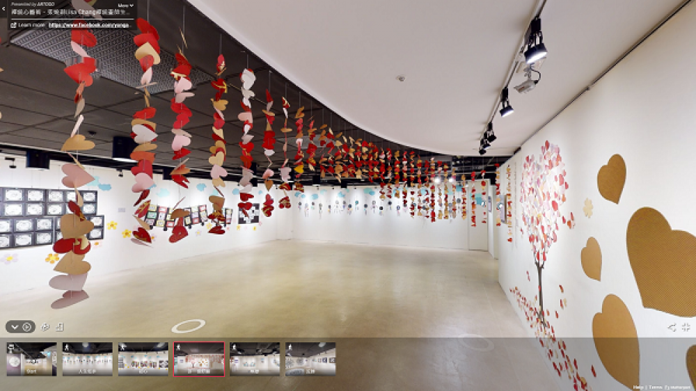 WebVR呈現展覽,首先利用攝影機捕捉畫面,再後製合成為3D實境場景,觀眾彷彿步行在展覽現場,一一觀覽每件作品、每段文字,欣賞作品中曲面、線條、符紋等纏繞畫元素,如同親臨展場的體驗。其中「許一個好願」由多位藝術家共同創作,匯集近千片桃紅色系心型紙片,貼滿牆面或以細線串聯吊掛,製作團隊在拍攝時捕捉多重視點,期望營造出讓觀眾穿梭其間感受,透過滑鼠縮放,在家也可以看到禪繞畫的細膩筆觸,為心靈帶來安定。