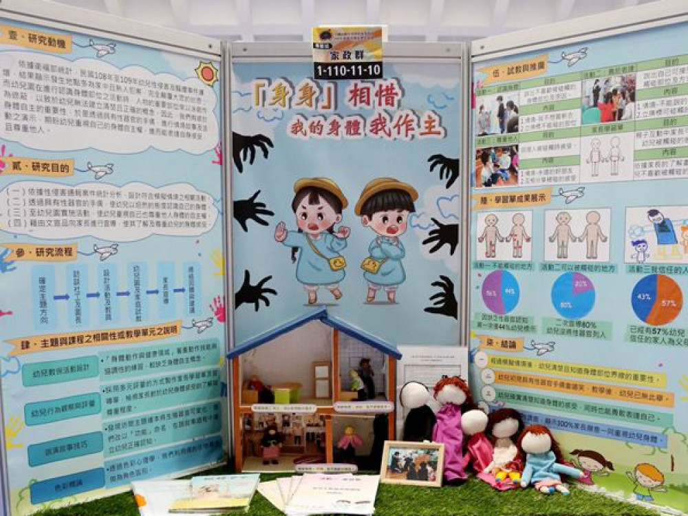 本年度競賽作品專題組以專業、節能與實用性為主;創意組以環保、結合生活與獨創性為主。其中,專題組家政群作品「身身相惜─我的身體我做主」,透過故事模擬情節,在活動中讓參與者理解性教育中身體自主權的重要性,並設計製作人形海報及手偶兩種教具,人形海報以正反面的人形及重要部位圖示、五個手偶的演示,教導幼兒及家長尊重自己及他人的重要性。