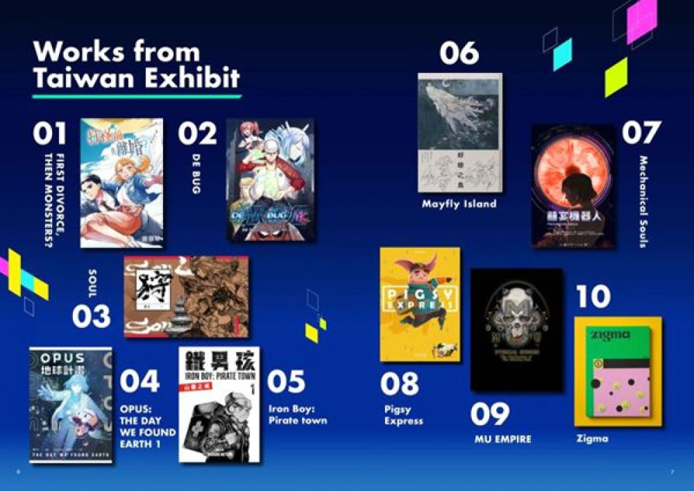 社團法人中華動漫出版同業協進會協助策劃設計本屆線上臺灣館,精選出的10部參展作品,陣容華麗堅強。包括安妮羊《打怪前先離婚?》、周巘《DE(祓)BUG(魔)》、蚩尤《狩SOUL》、陳PN《OPUS地球計畫》、麥人杰《鐵男孩:山寨之城》、葉長青《蜉蝣之島》、徐幼禹《囍宴機器人》、邱立偉《未來宅急便》、氫酸鉀《姆帝國》,以及奧斯卡等7位創作者共同推出的《Zigma》,打造臺灣賽博龐克式未來想像,帶領觀眾暫離現實,體驗各種關於未來的想像。10部作品均收錄在2021臺灣館線上型錄,歡迎民眾瀏覽及下載收藏。